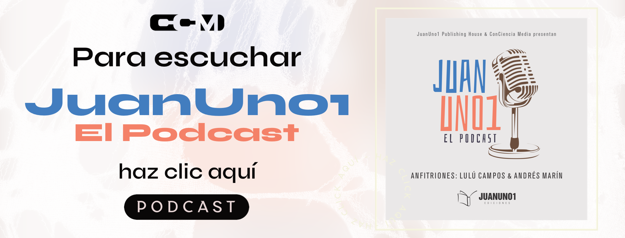 “JuanUno1 es podcast es una colaboración de JuanUno1 Ediciones y Publishing House con ConCiencia Media. En este podcast queremos hablar en cada episodio de un Libro del catalogo de JuanUno1. Lulu Campos y Andres Marin estarán hablando con los autores o Traductores de cada una de las obras, su meta es promover el libro y hablar del corazón del mismo.”